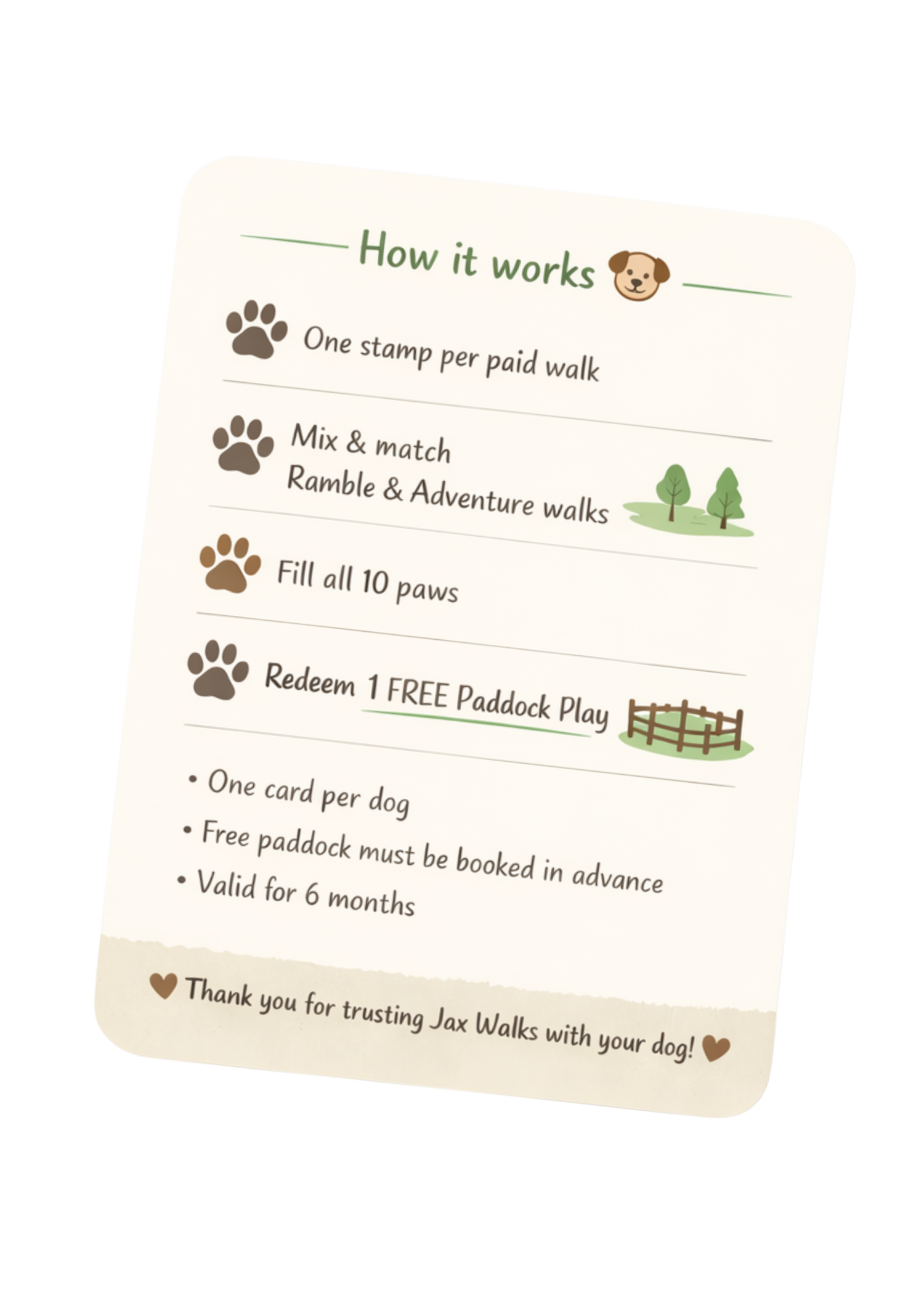 At Jax Walks, we love rewarding loyalty β and the Happy Hounds Loyalty Card is our way of saying thank you for trusting us with your dog.